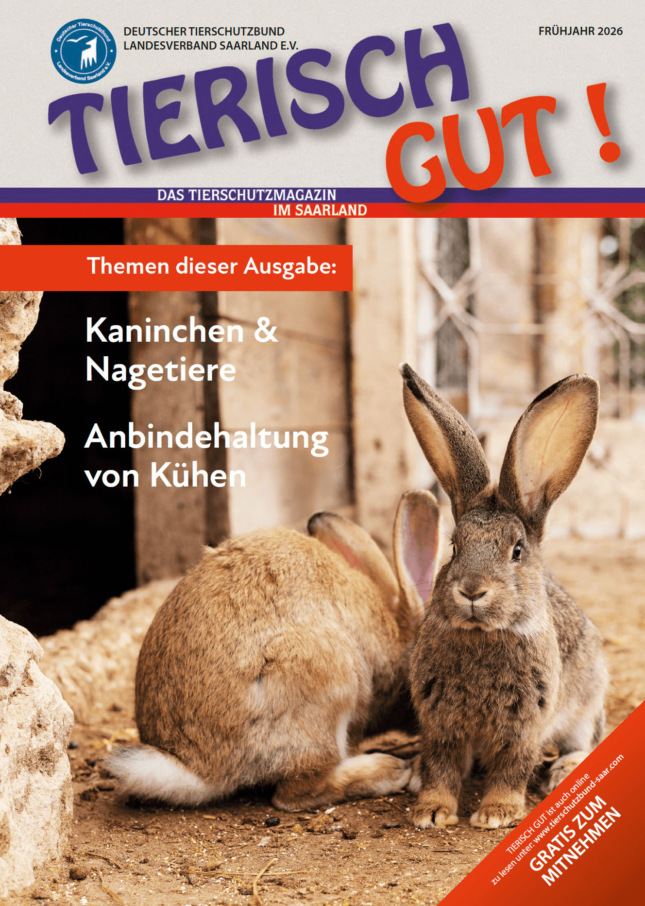Mehrmals jährlich informieren wir Sie mit „Tierisch Gut!“ über aktuelle Entwicklungen im Tierschutzverband Saarland: zu Themen wie Haltung von Kaninchen und Nagetieren, Anbindehaltung von Tieren oder politischer Arbeit. Die kostenlose Printausgabe wird an unsere Mitgliedsvereine verteilt – als PDF steht sie jederzeit online zum Download bereit.